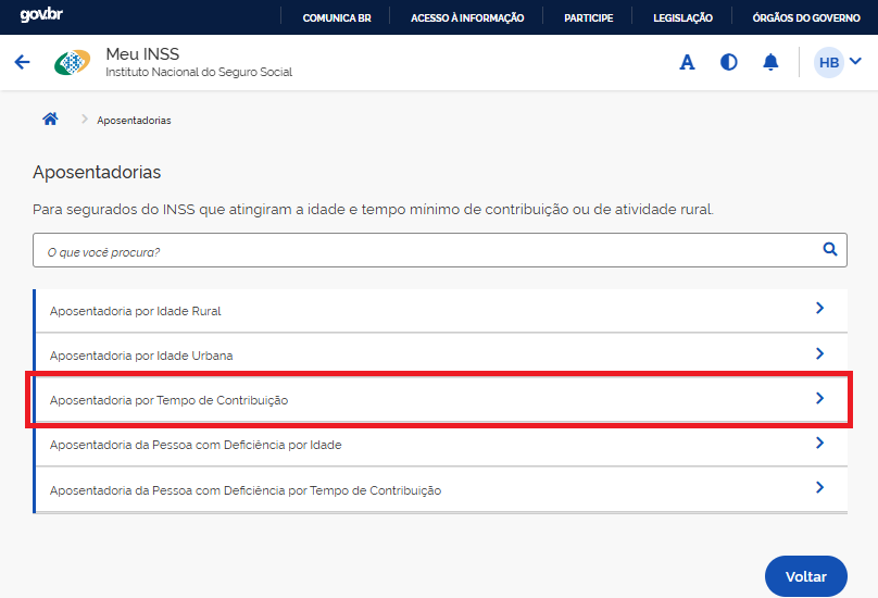 - Na barra de busca, digite “Aposentadoria por Tempo de Contribuição”.