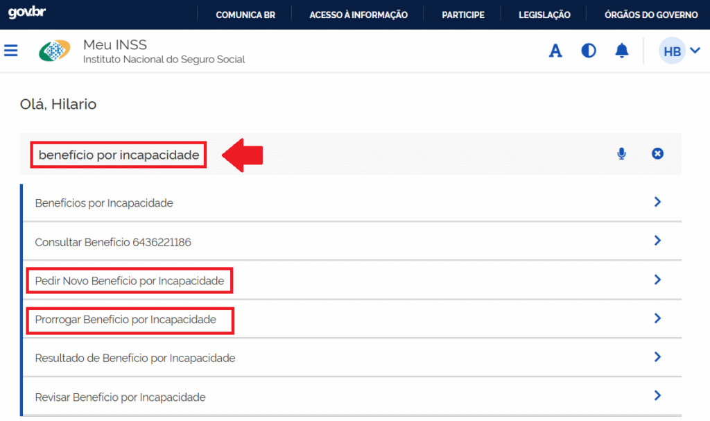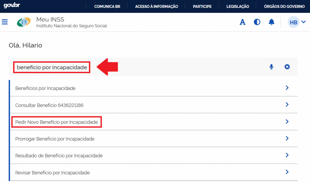 - Na barra de busca, digite “benefício por incapacidade”.