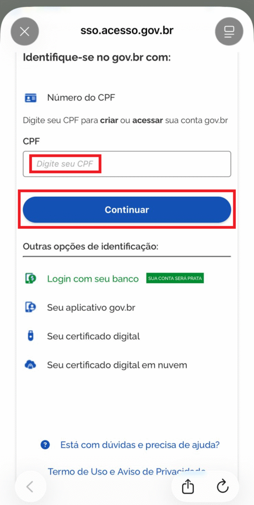 Digite seu CPF e clique em Continuar