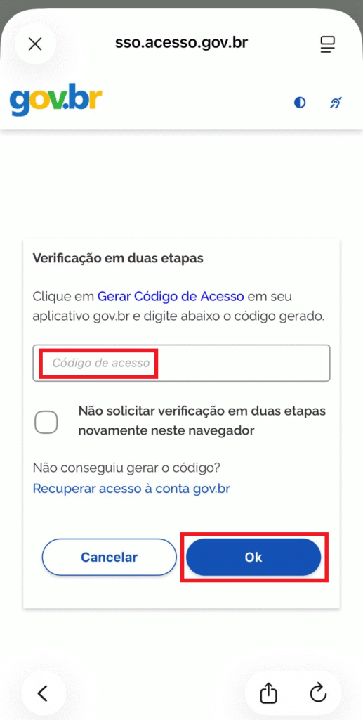 3. Verificação de duas etapas: pode ser necessário gerar um código no aplicativo gov.br