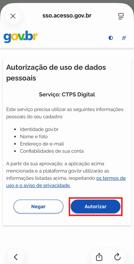 Por fim, basta clicar em Autorizar no aplicativo da CTPS Digital e você terá acesso a todas as funcionalidades.