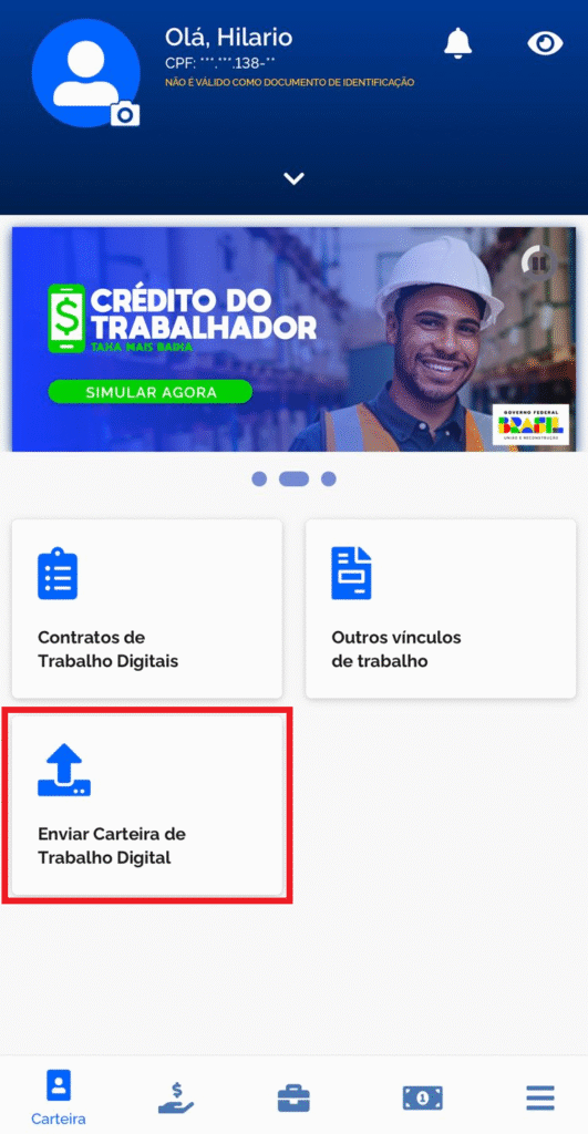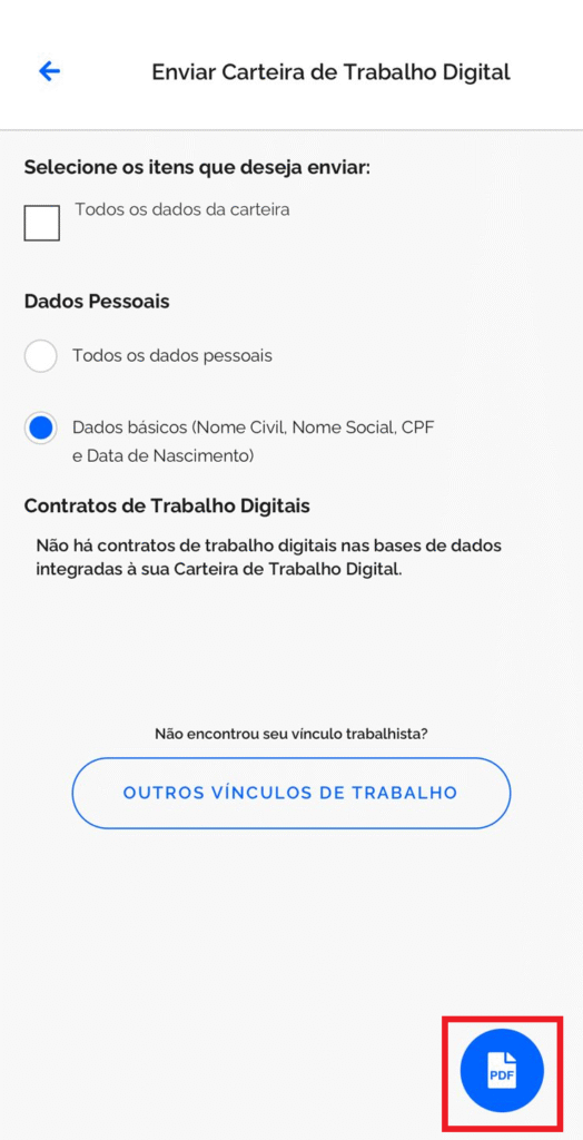 Para gerar o PDF da Carteira de Trabalho Digital, dentro do aplicativo ou site, basta clicar em “Enviar Carteira de Trabalho Digital”: