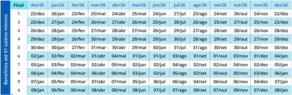 Calendário de pagamentos INSS 2026 (salário mínimo)